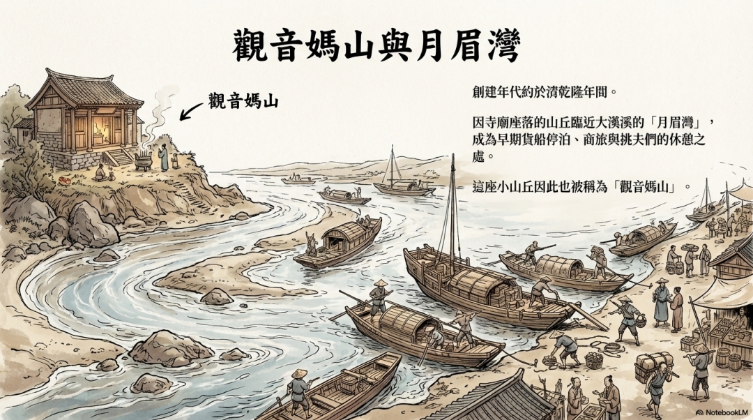 追溯其源,月眉山觀音寺的歷史可遠至17世紀中葉(清乾隆年間)。當時的大溪古稱「大姑陷」,作為淡水河上游水運的重要據點,乃是北台灣桃竹苗山區土產與民生用品的轉運碼頭,船隻往來如梭,挑夫、商旅絡繹不絕。為求行船平安、旅途順利,往來信眾在現址旁一座長滿蘆竹與雜草的小山丘半山腰,以三塊石板搭成簡易小屋,恭奉觀音石像,這便是寺廟的雛形。因觀音聖像安座於此,這座小山丘也被親切地稱為「觀音媽山」,而寺廟最初則得名「觀音媽山觀音媽廟」,成為往來行旅心靈的寄託之所。