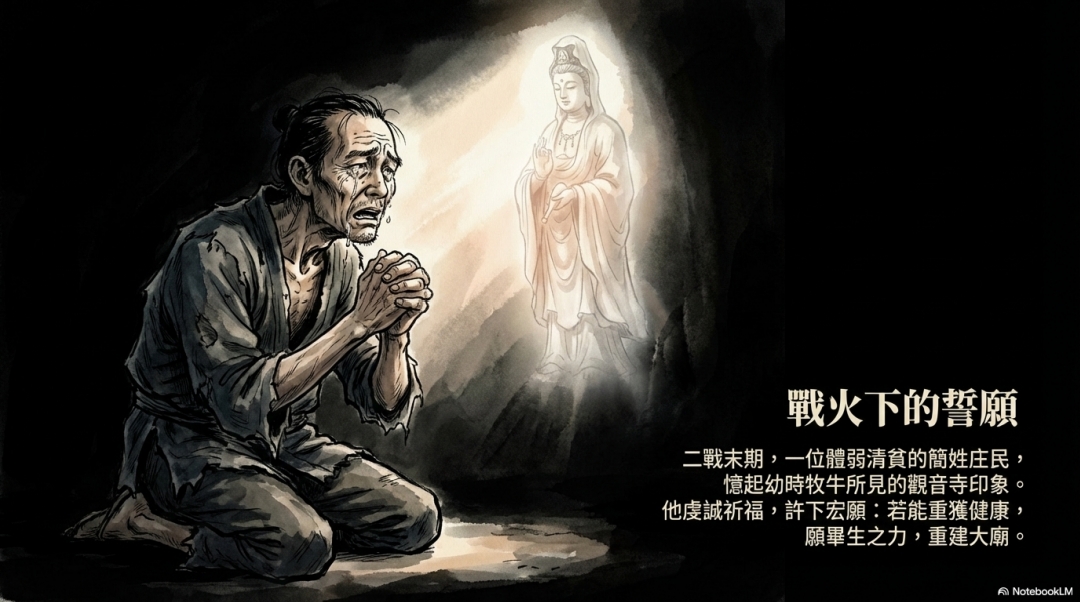 歲月流轉至二次大戰末期,百姓飽受戰亂之苦,庄民簡金乎君家境清貧且體弱多病,在萬念俱灰之際,憶起幼年牧牛時曾見觀世音菩薩安座於觀音媽山半山腰石壁間,遂前往祈願:若身體能得康復,必為菩薩塑像建廟。