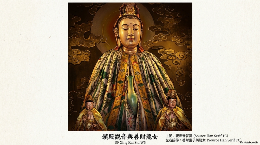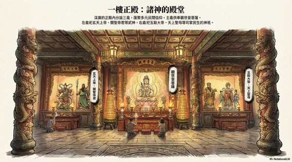 深廣的正殿內分設三龕,匯聚多元民間信仰。主供奉觀世音菩薩, 左龕祀玄天上帝、關聖帝君等武神,右龕祀五大帝、天上聖母等司掌民生的神祇