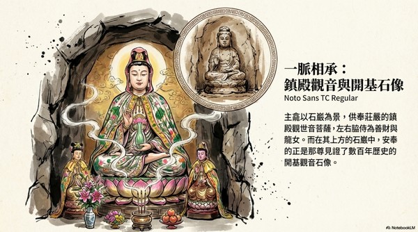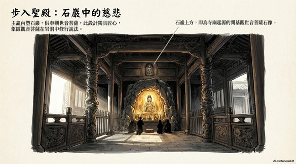 主龕內塑石,供奉觀世音菩薩,此設計獨具匠心, 象徵觀音菩薩在岩洞中修行說法。