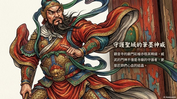 觀音寺的廟門彩繪亦極其精細,威武的門神不僅 是寺廟的守護者,更是匠師們心血的結晶。