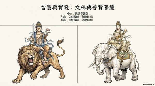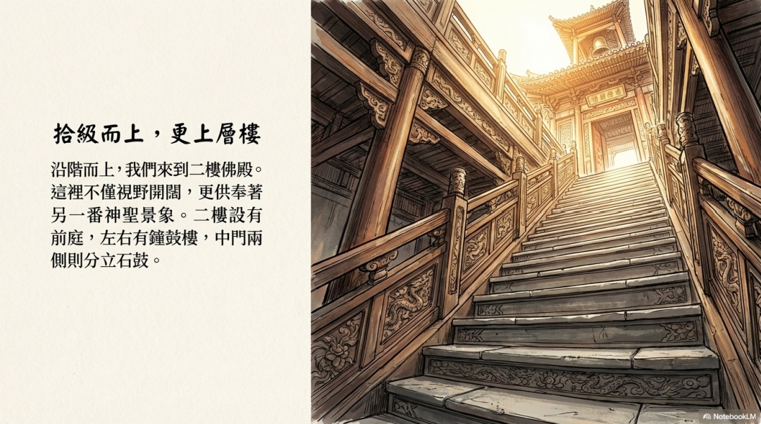 沿階而上,我們來到二樓佛殿。 這裡不僅視野開闊,更供奉著 另一番神聖景象。二樓設有 前庭,左右有鐘鼓樓,中門兩 側則分立石鼓。