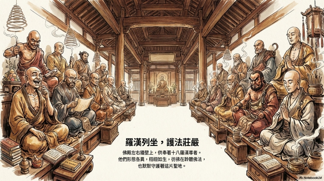 佛殿的左、右兩壁,供奉著十八羅漢尊者。他們神態各異,莊嚴而生動,共同守護著這方清淨佛地。