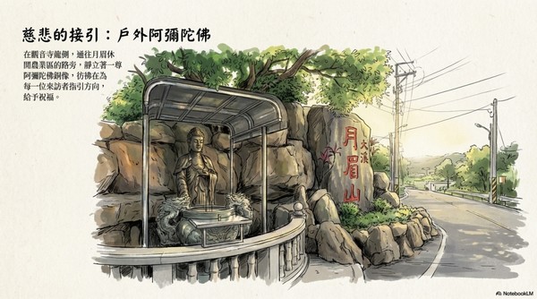 在觀音寺龍側,通往月眉休閒農業區的路旁,靜立著一尊阿彌陀佛銅像,彷彿在為 每一位來訪者指引方向, 給予祝福